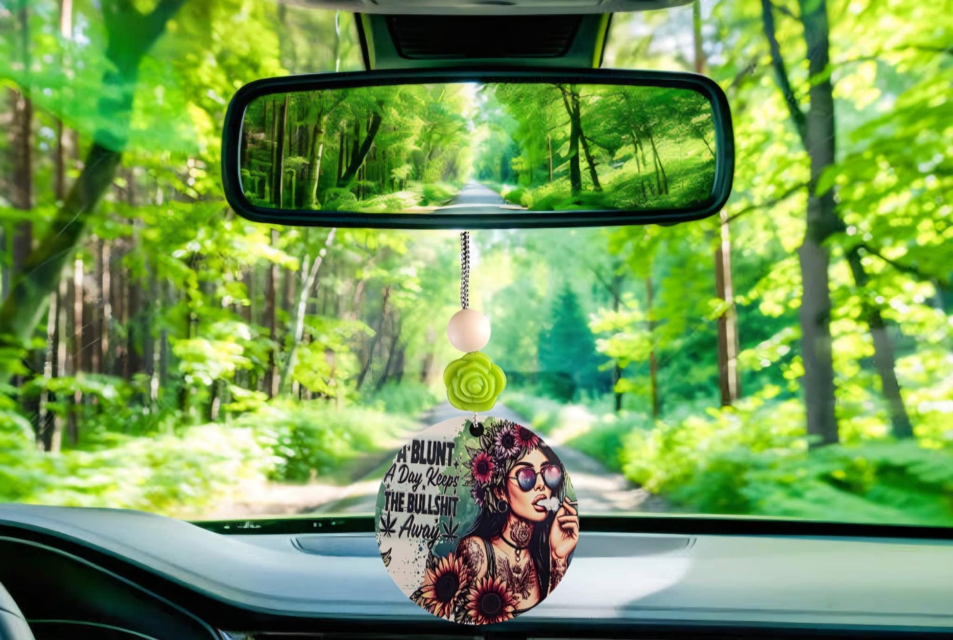 Disc is 7 cm Hanging length is 30 cm The disc is made out of MDF material, and the Chain is a Metal beaded chain, joined together by metal connectors. Comes with random coloured silicone beads to match the design, the silicone beads are waterproof and heat - resistant and are unaffected by weather changes. Add a touch of your style to your car with this gorgeous Car charm