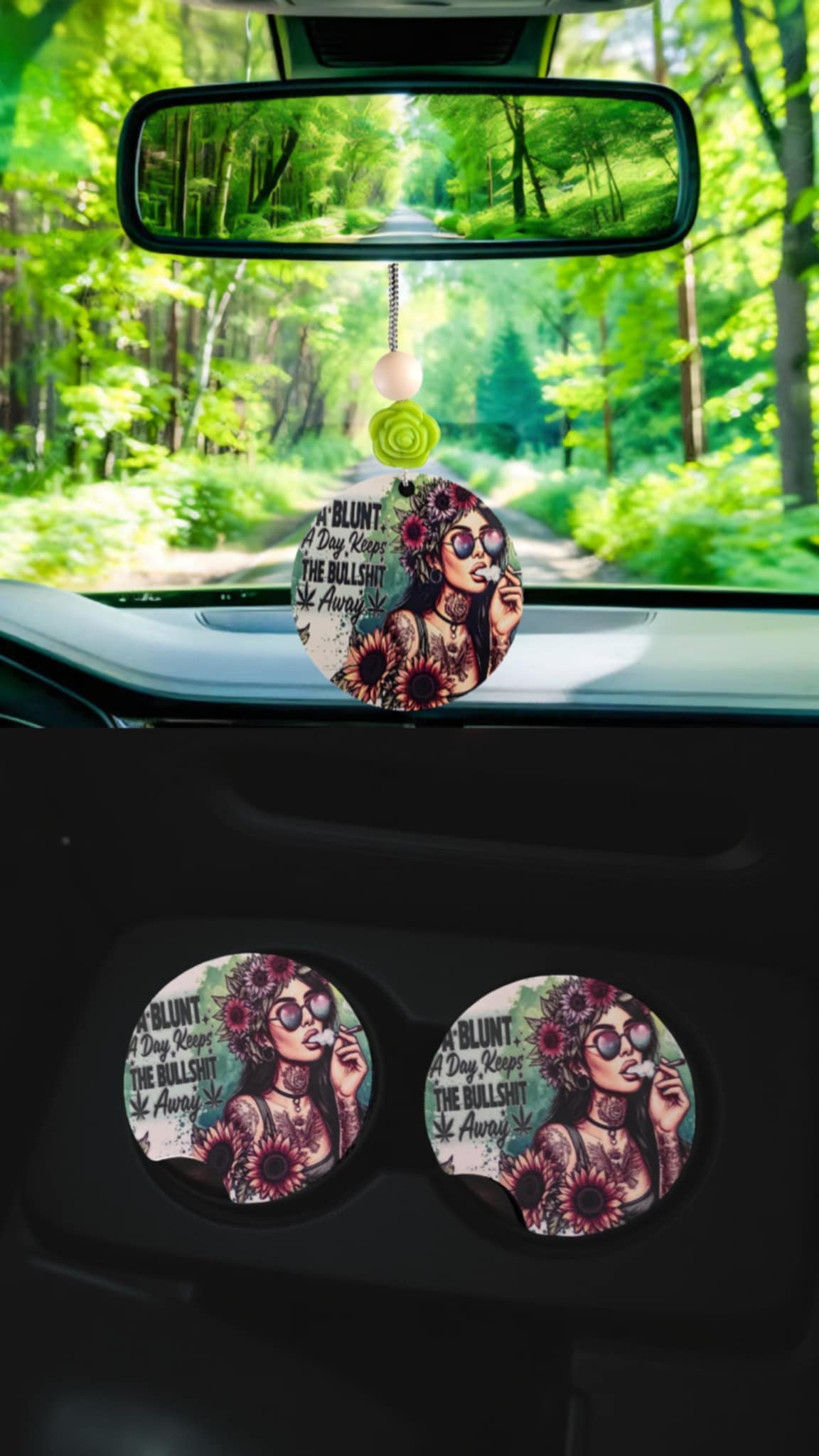 Car Charms- Disc is 7 cm Hanging length is 30 cm The disc is made out of MDF material, and the Chain is a Metal beaded chain, joint together by metal connectors. Comes with random coloured silicone beads to match the design, the silicone beads are waterproof and heat - resistant and are un affected by the weather changes. Car Coasters - Coasters are 7 cm. Set of 2 Car Coasters are soft and durable with an anti-slip material. Made from Neoprene rubber with a smooth polyester surface. These fit most cars but please measure your car cup holder prior to purchase. They are easy to remove and clean, just remove the coaster, clean with a wet cloth or wash in water and then sit flat to dry. Car coasters keep your cup holders clean and dry with added style! Coasters are a universal fit and super-easy to install. Maximum bling for your cup holder. Add a touch of your style to your car with this Car charm and Car Coaster Set.