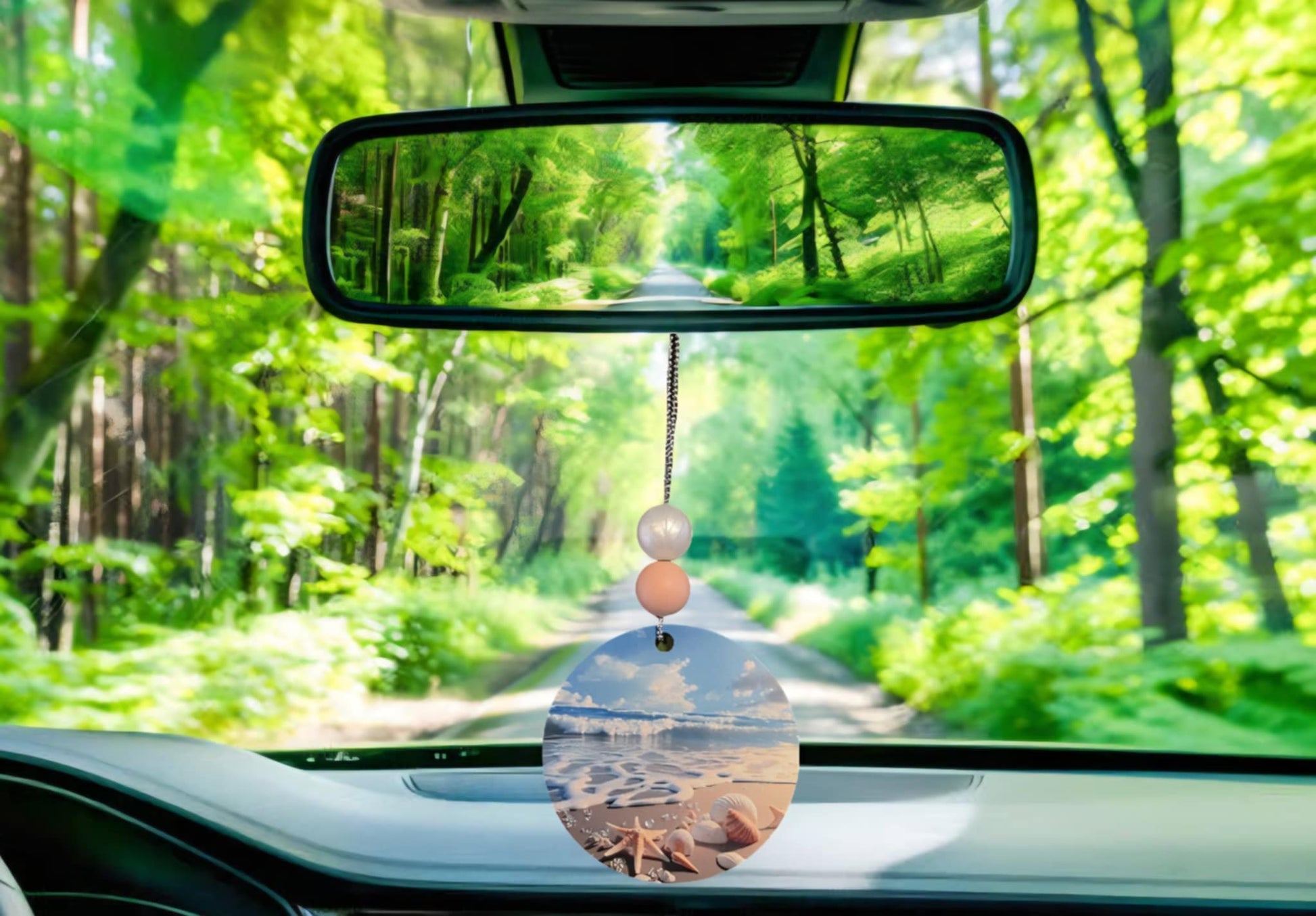 Disc is 7 cm Hanging length is 30 cm The disc is made out of MDF material, and the Chain is a Metal beaded chain, joined together by metal connectors.