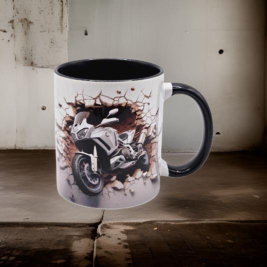 This design has a Bike breaking through a wall is great for anyone who loves Bikes . The mug handles are the same colour as inside the mug to add a little bit of extra WOW to your mug. Choose from 10 different colours. They are also Individually boxed.