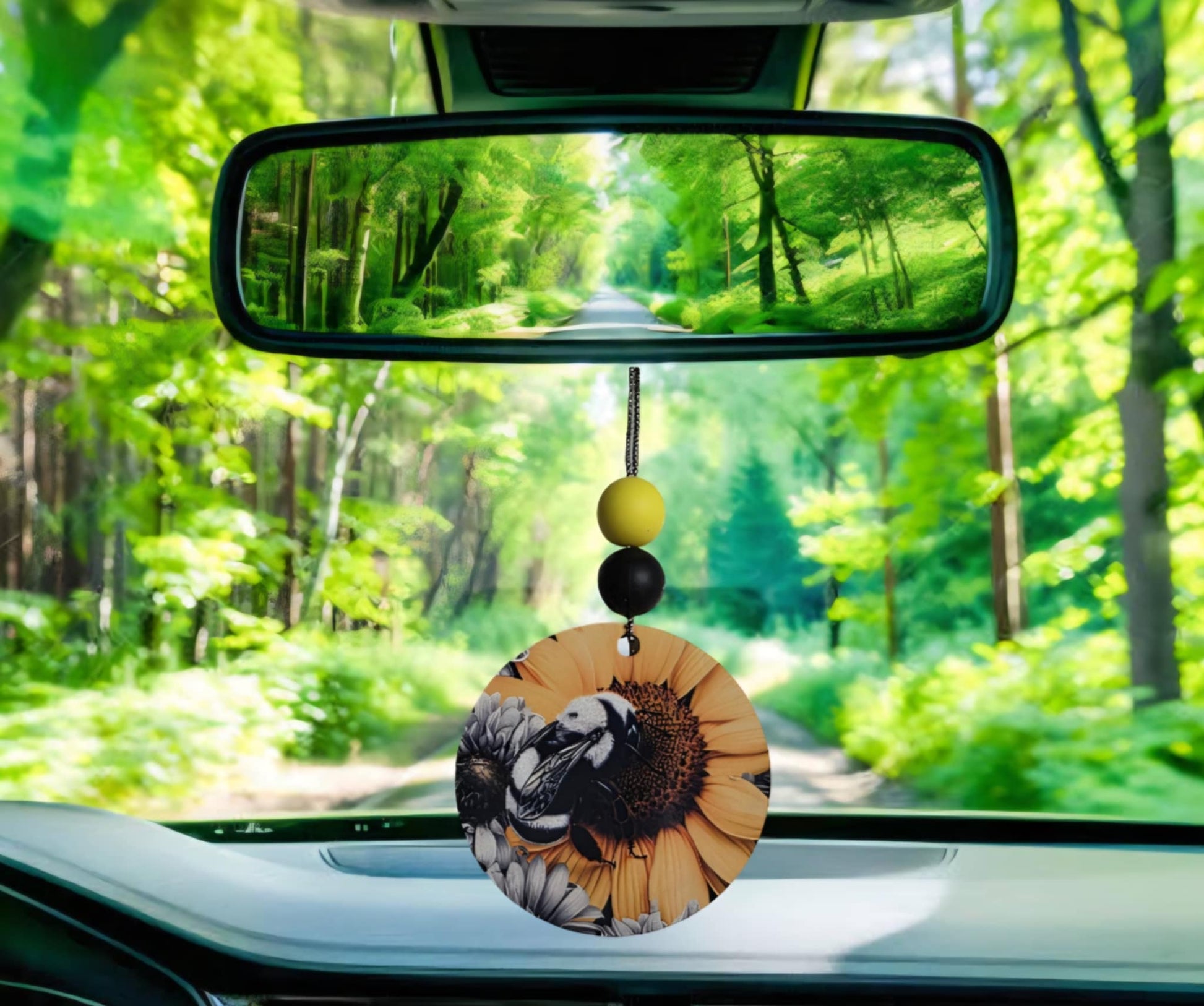 Disc is 7 cm Hanging length is 30 cm The disc is made out of MDF material, and the Chain is a Metal beaded chain, joined together by metal connectors. Add a touch of your style to your car with this gorgeous Car charm