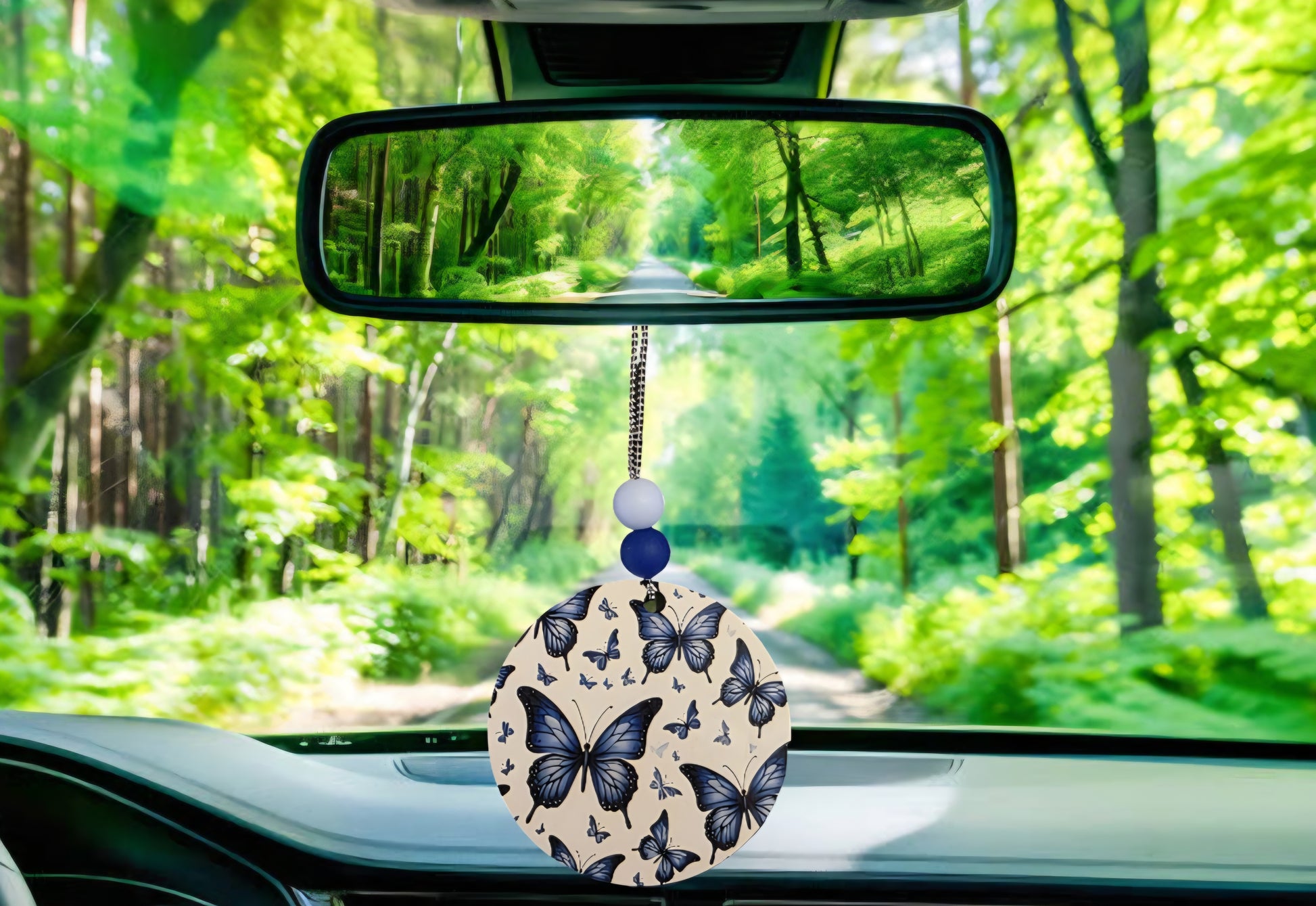Disc is 7 cm Hanging length is 30 cm The disc is made out of MDF material, and the Chain is a Metal beaded chain, joint together by metal connectors.