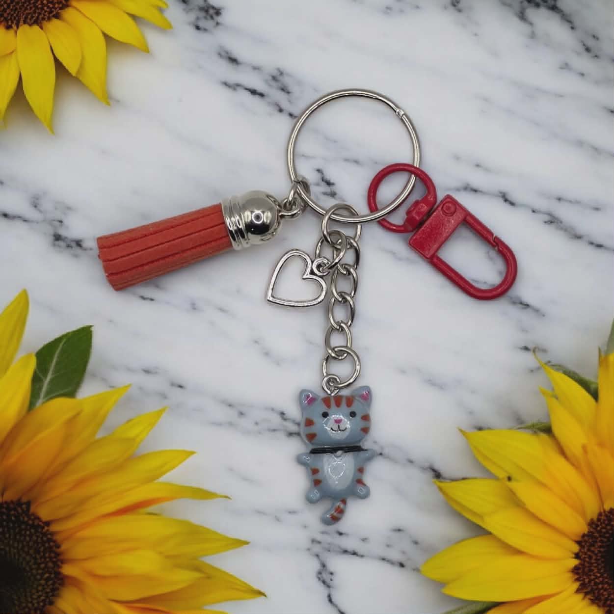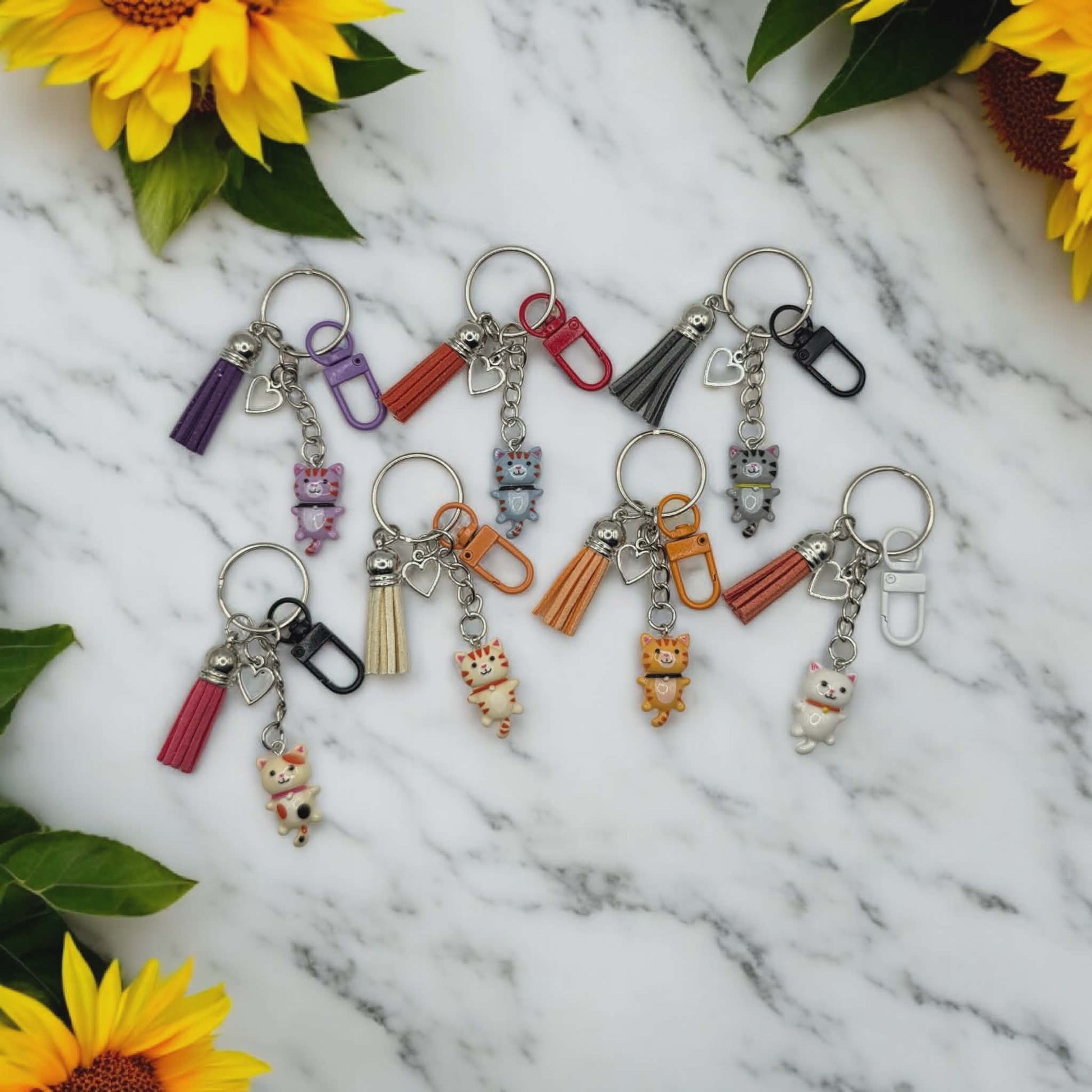Cute little cat keychain. Comes with a little heart charm attached. Comes on a Silver keychain, with a coloured clasp matching the colours of each individual cat keychain. Each keychain also comes with a matching coloured small tassel. Perfect gift for someone special you know is a cat lover.