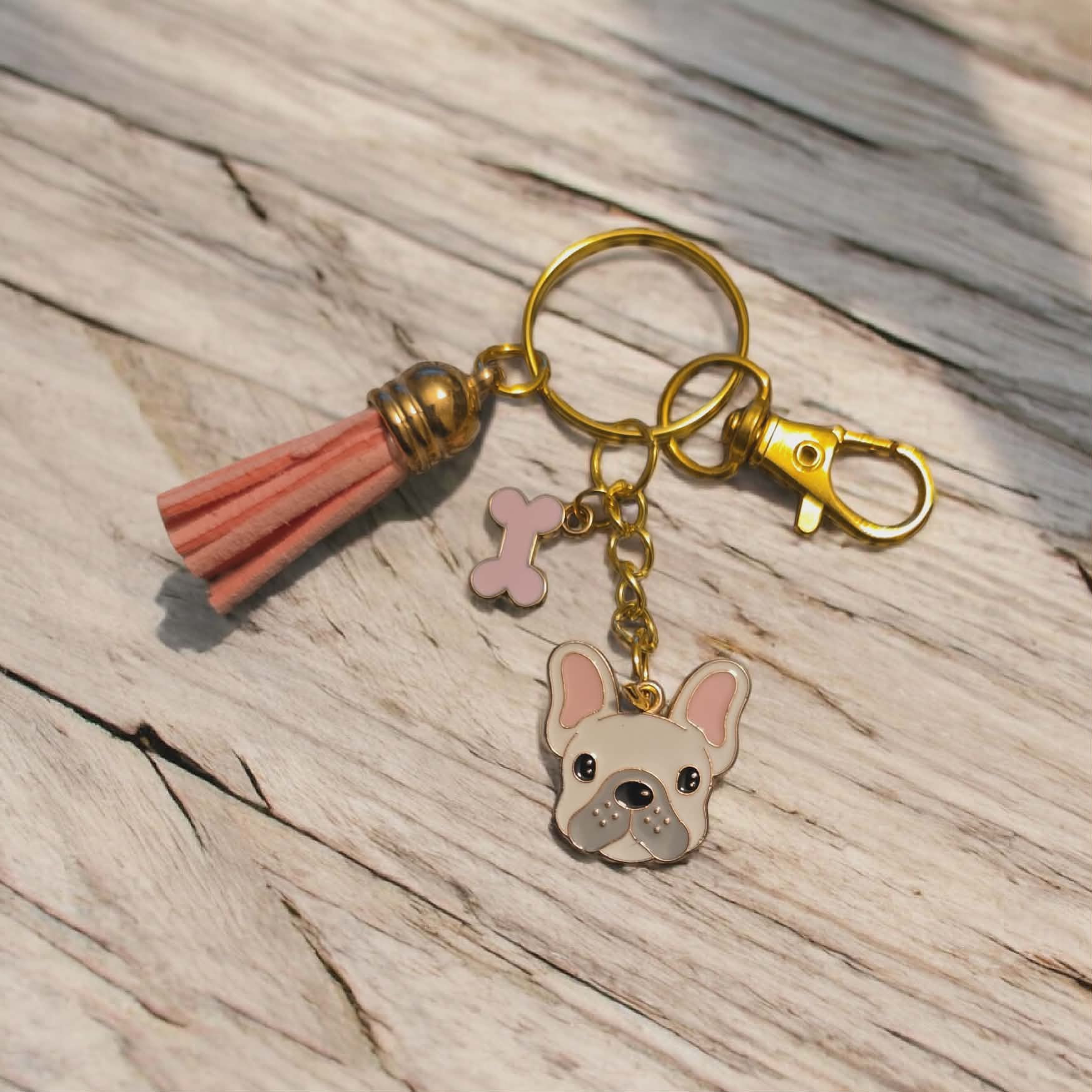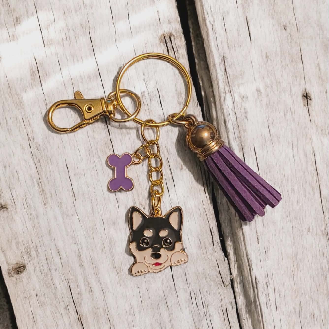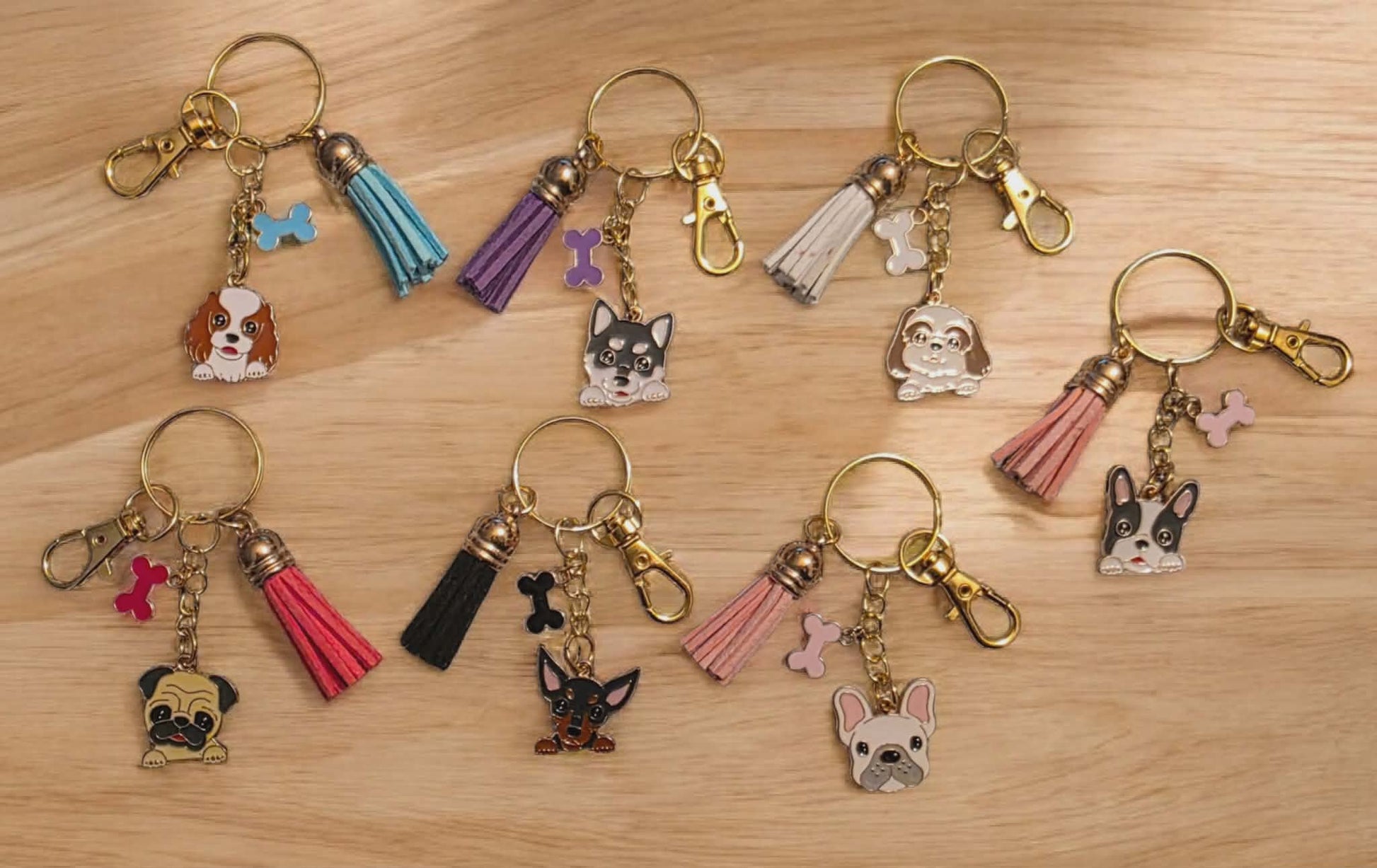 Dog Breed keychain with coloured bone charm. Comes with a matching coloured tassel to the bone charm. Comes on a Gold keychain, with a gold clasp attached to make it easy to attach to keys, purses, handbags. Perfect gift for someone special you know loves Sunflowers.