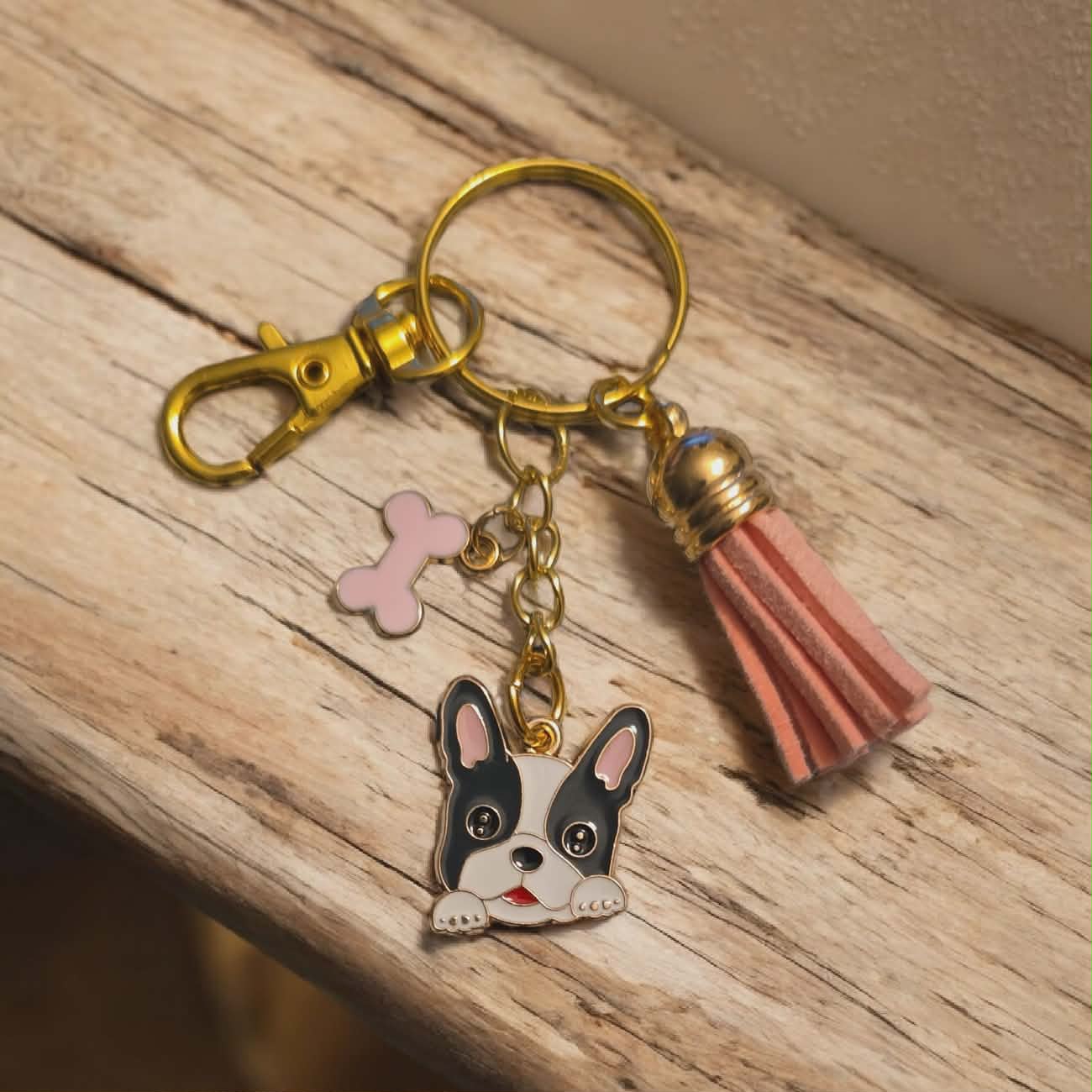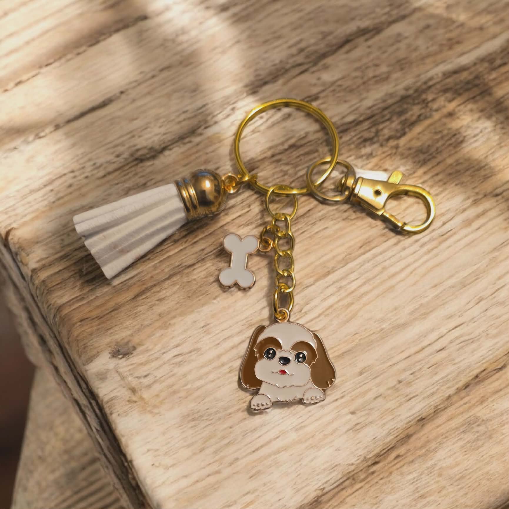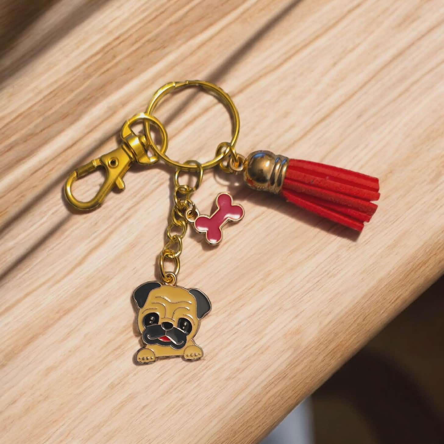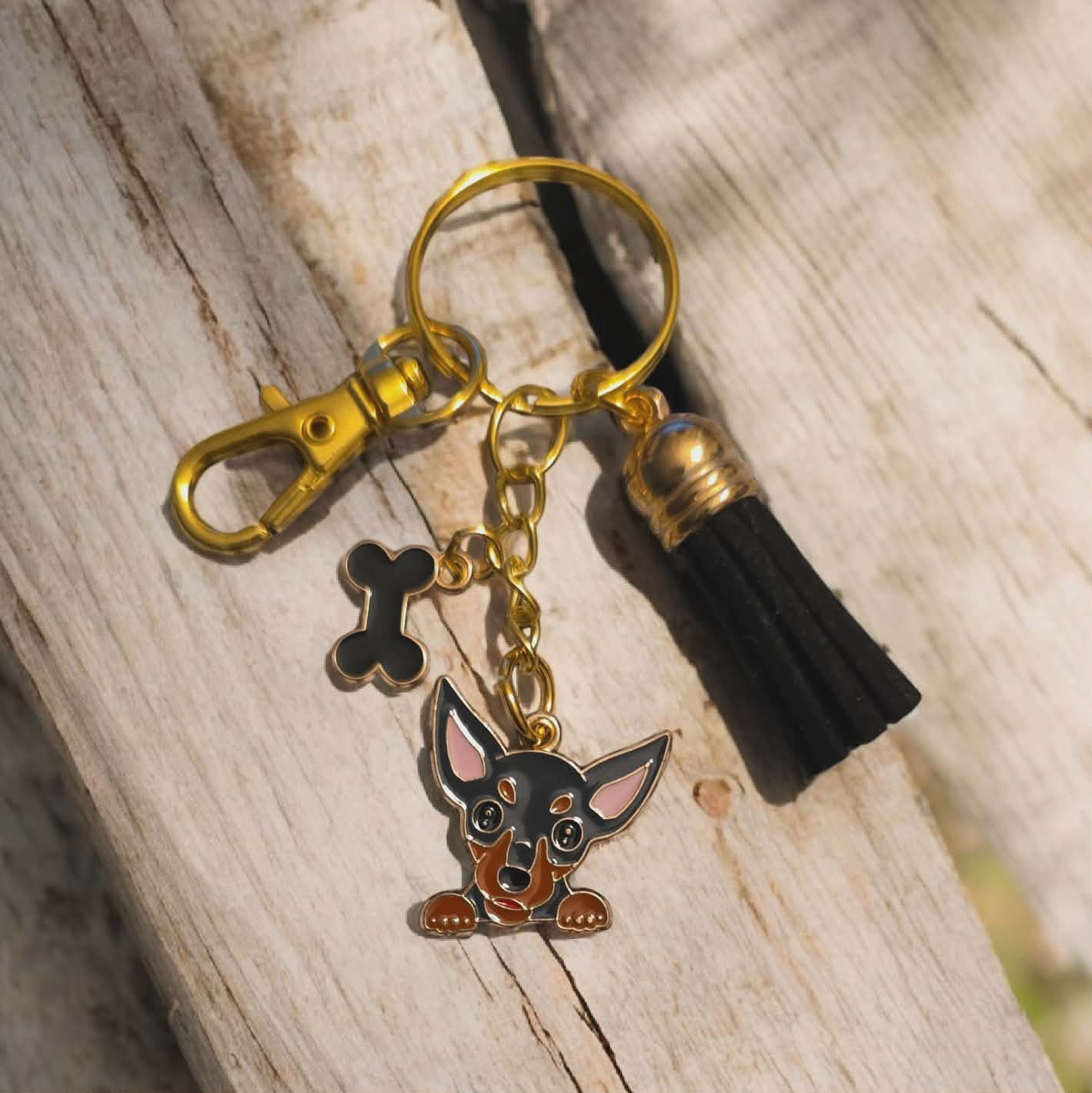 Dog Breed keychain with coloured bone charm. Comes with a matching coloured tassel to the bone charm. Comes on a Gold keychain, with a gold clasp attached to make it easy to attach to keys, purses, handbags. Perfect gift for someone special you know loves Sunflowers.