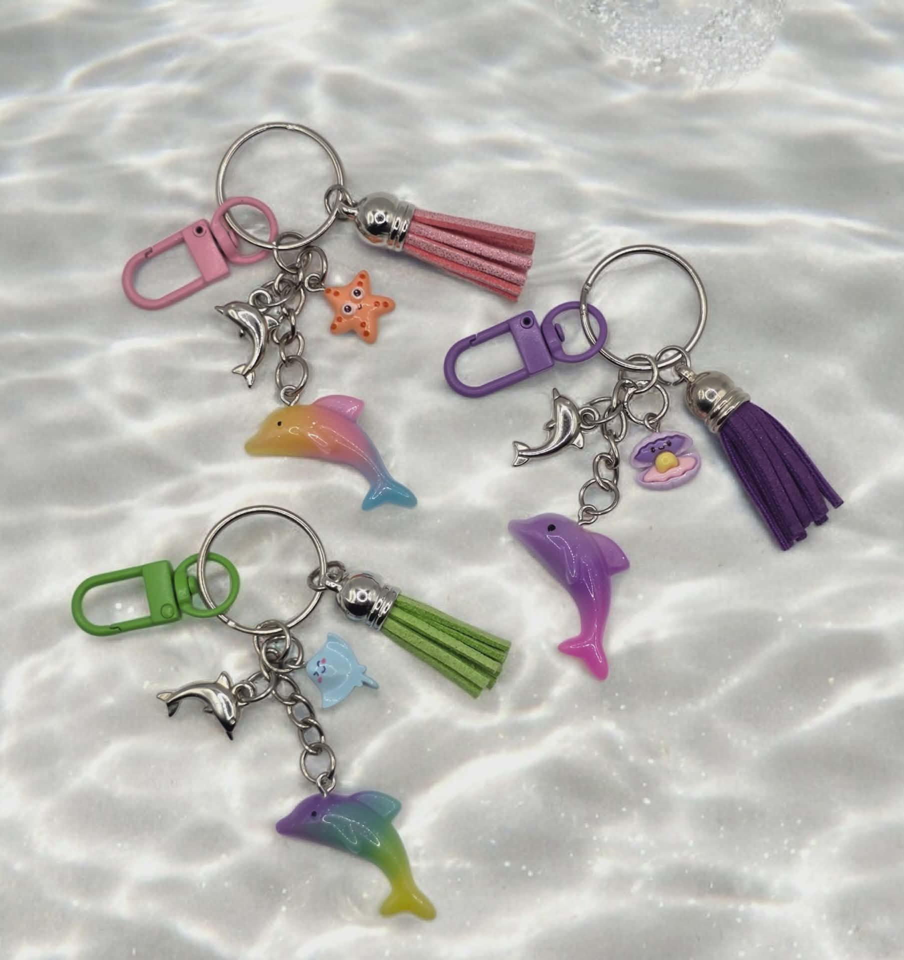 Cute Ombre Dolphin keychain. Comes with a little Sea charm and a little silver dolphin charm attached. Comes on a Silver keychain, with a coloured clasp matching the colours of each individual dolphin keychain. Each keychain also comes with a matching coloured small tassel. Each Ombre Dolphin may slightly vary in the amounts of each colour on the dolphin. Perfect gift for someone special you know is a dolphin lover.
