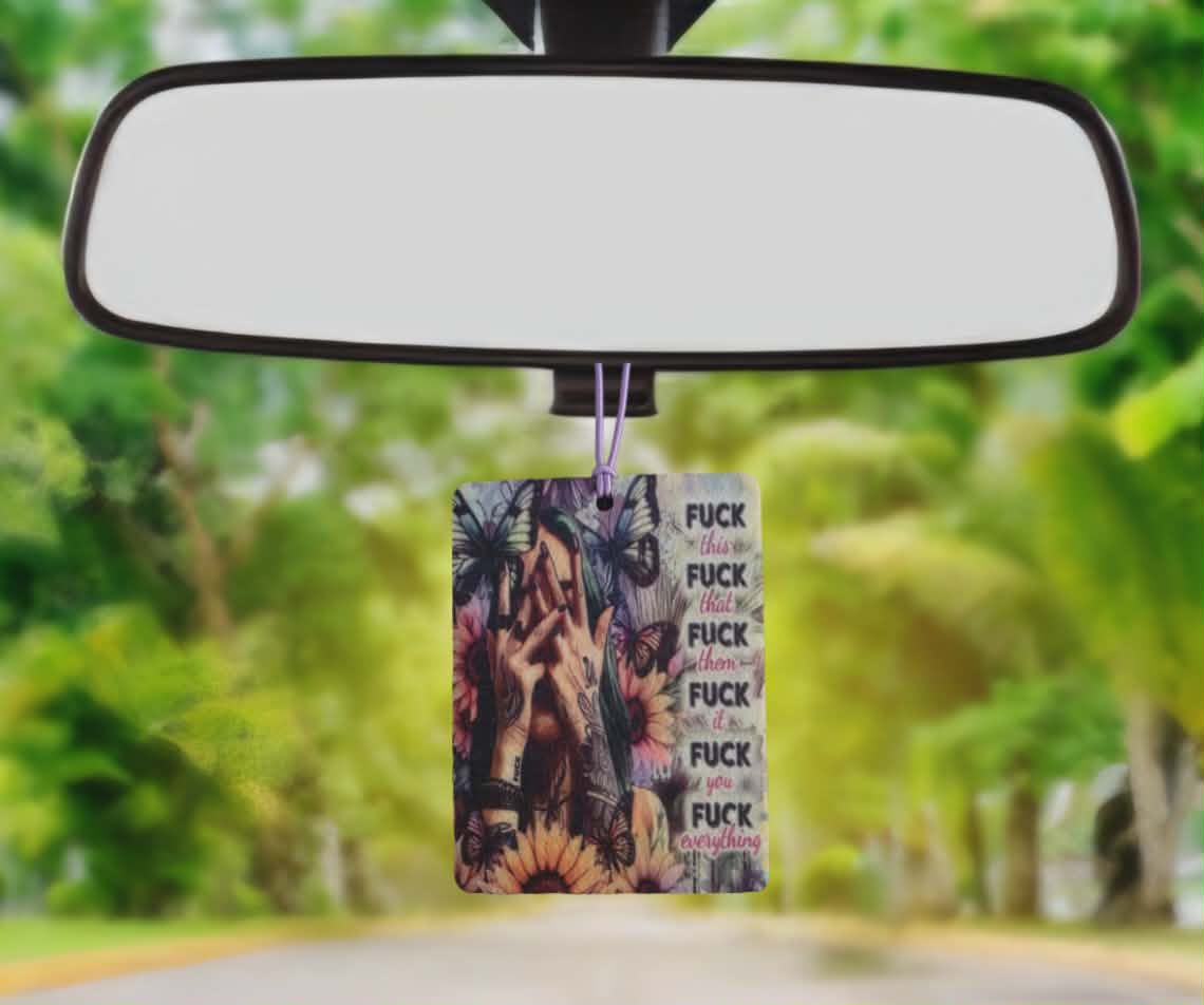 Our Air fresheners Measure at (L)10 cm (W)7.5 cm Just add a few drops of your favourite essential oil or perfume to your air freshener. Make sure the oil or perfume you use is clear in colour. And away you go with an amazing-smelling car.