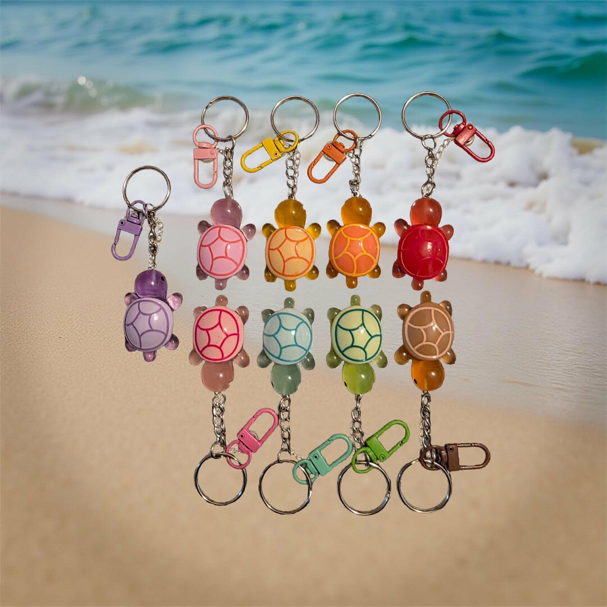 These are beautiful turtle keychains Glow in the Dark. The Turtles come in 9 different colours, that has a matching colour clasp attached, to make it easy to attach to keys, purses, handbags. Turtles measure at 5 cm (L) and 3 cm (W). Full length of the keychain measures at 10 cm (L).