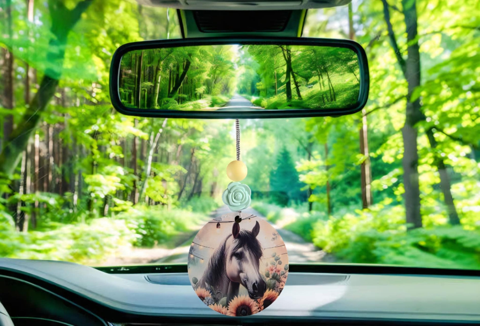 Disc is 7 cm Hanging length is 30 cm The disc is made out of MDF material, and the Chain is a Metal beaded chain, joined together by metal connectors. Comes with random coloured silicone beads to match the design, the silicone beads are waterproof and heat - resistant and are unaffected by weather changes. Add a touch of your style to your car with this gorgeous Car charm