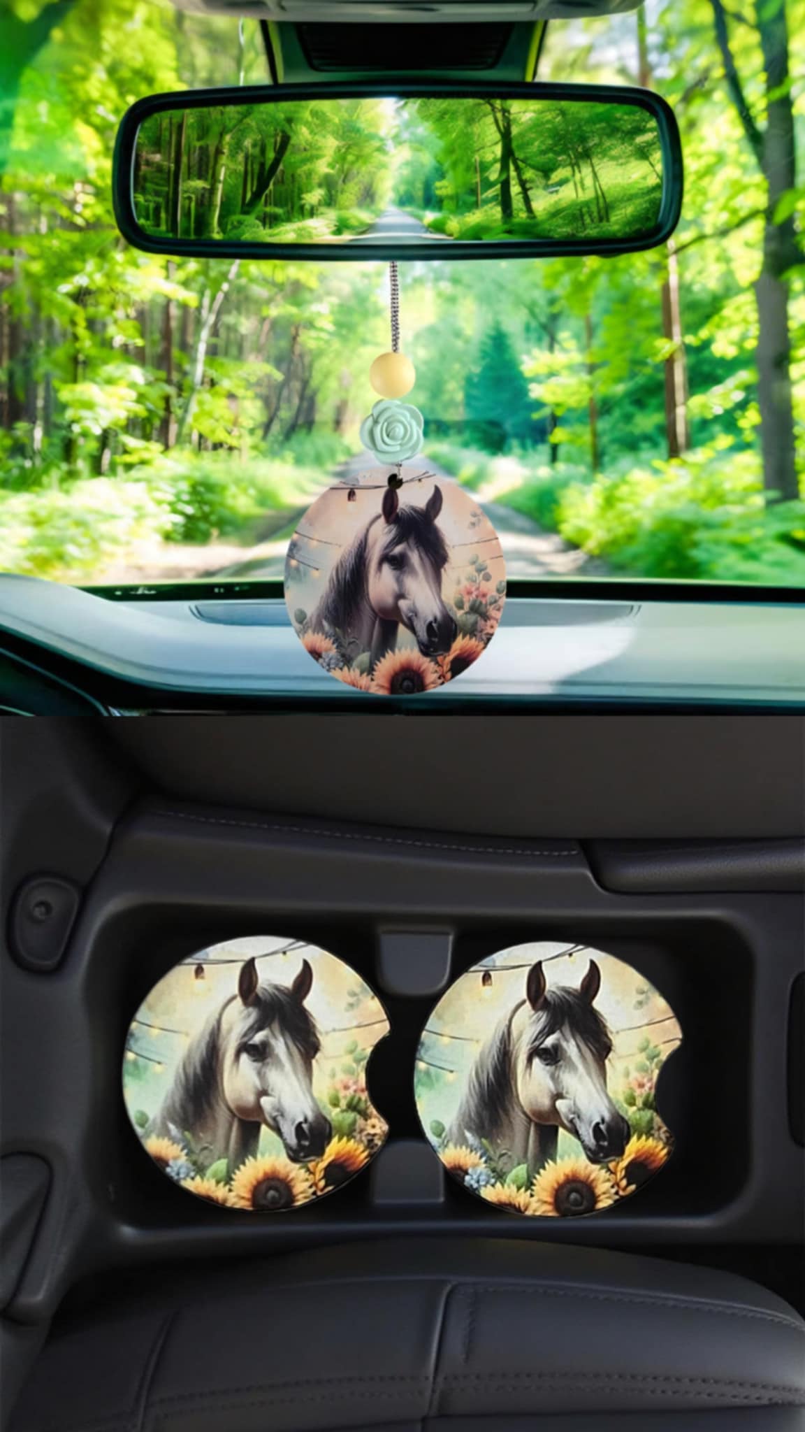 Car Charms- Disc is 7 cm Hanging length is 30 cm The disc is made out of MDF material, and the Chain is a Metal beaded chain, joint together by metal connectors. Comes with random coloured silicone beads to match the design, the silicone beads are waterproof and heat - resistant and are un affected by the weather changes. Car Coasters - Coasters are 7 cm. Set of 2 Car Coasters are soft and durable with an anti-slip material. Made from Neoprene rubber with a smooth polyester surface. These fit most cars but please measure your car cup holder prior to purchase. They are easy to remove and clean, just remove the coaster, clean with a wet cloth or wash in water and then sit flat to dry. Car coasters keep your cup holders clean and dry with added style! Coasters are a universal fit and super-easy to install. Maximum bling for your cup holder. Add a touch of your style to your car with this Car charm and Car Coaster Set.