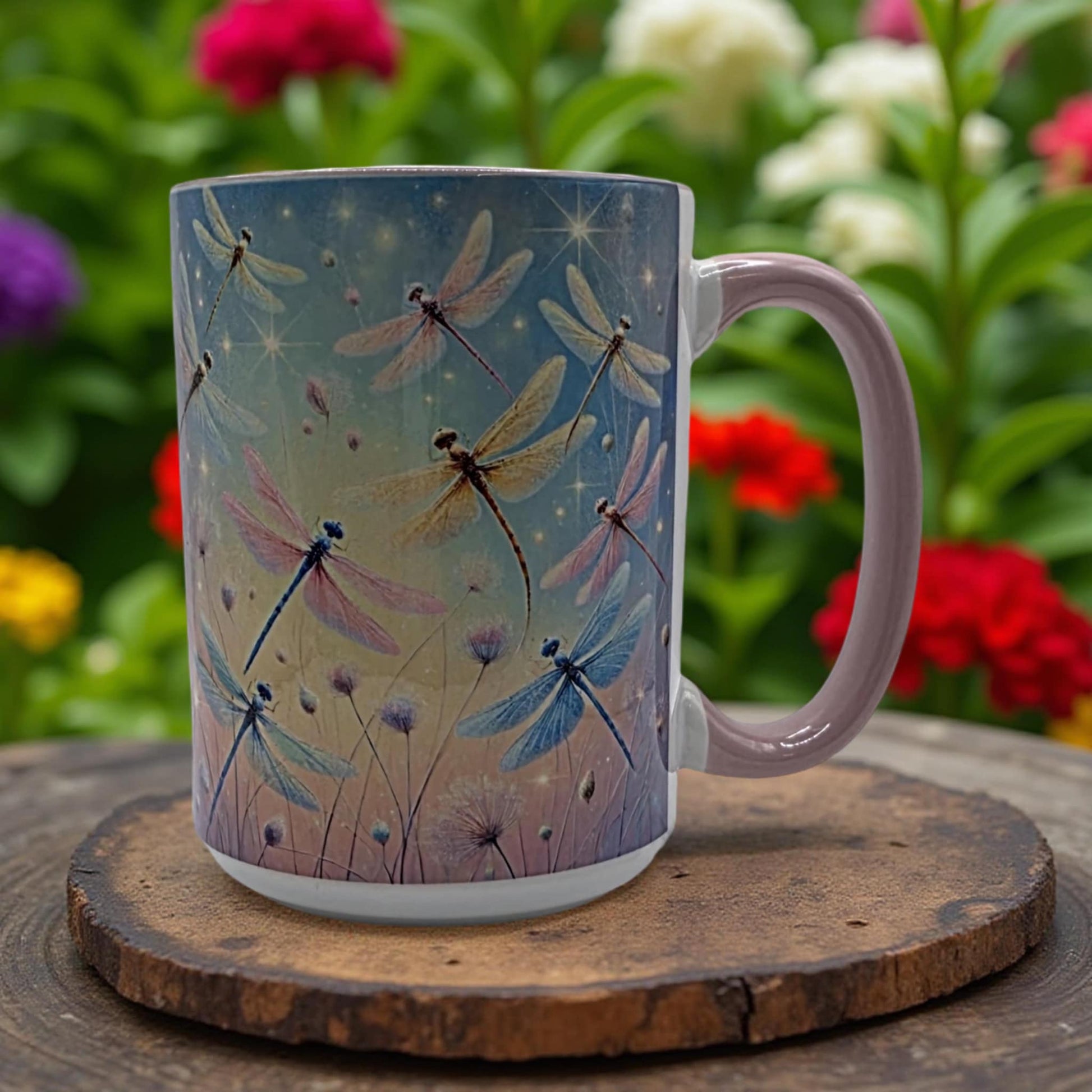 Pink, Blue and yellow Dragonflies