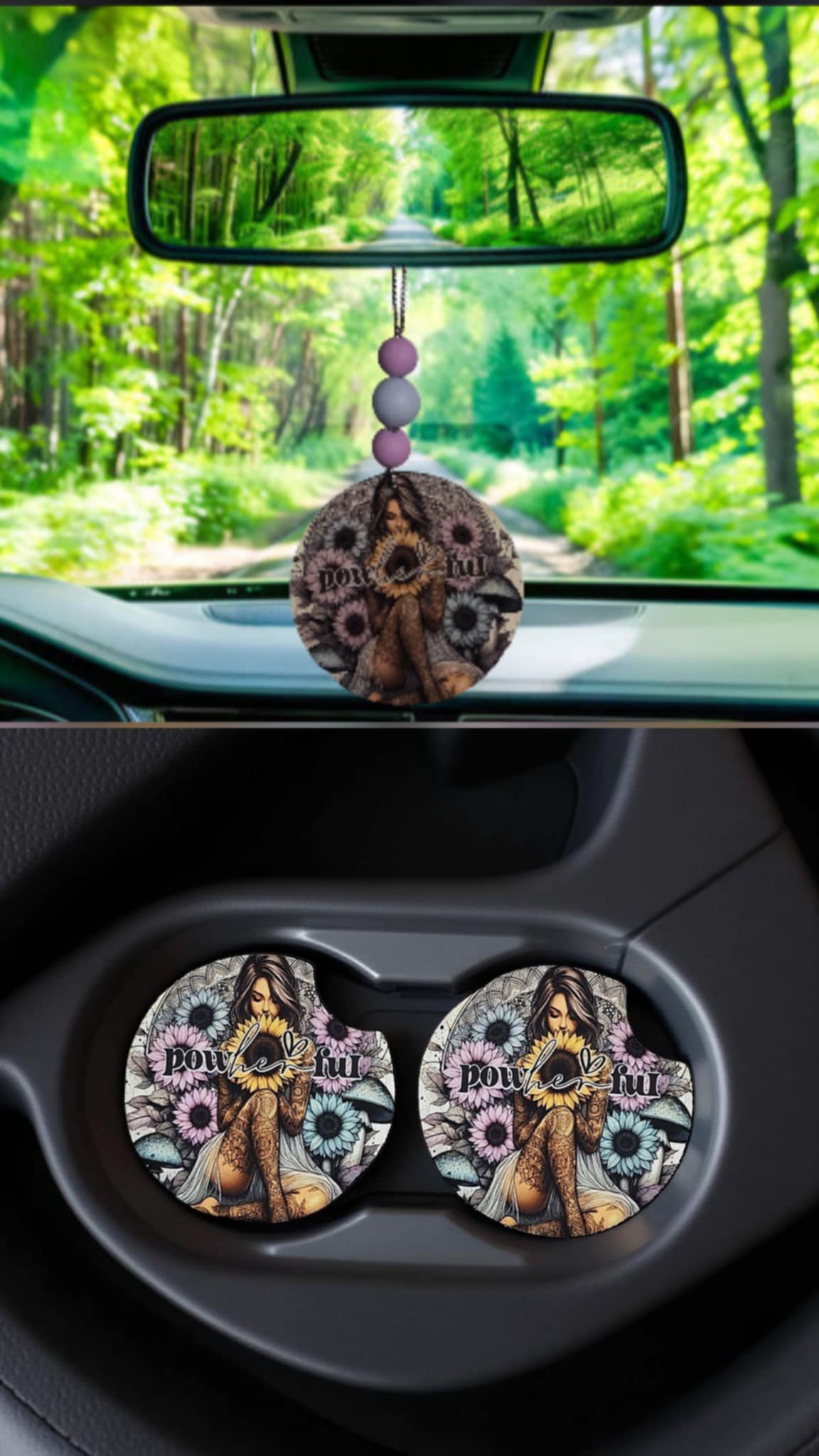Car Charms- Disc is 7 cm Hanging length is 30 cm The disc is made out of MDF material, and the Chain is a Metal beaded chain, joint together by metal connectors. Comes with random coloured silicone beads to match the design, the silicone beads are waterproof and heat - resistant and are un affected by the weather changes. Car Coasters - Coasters are 7 cm. Set of 2 Car Coasters are soft and durable with an anti-slip material. Made from Neoprene rubber with a smooth polyester surface. These fit most cars but please measure your car cup holder prior to purchase. They are easy to remove and clean, just remove the coaster, clean with a wet cloth or wash in water and then sit flat to dry. Car coasters keep your cup holders clean and dry with added style! Coasters are a universal fit and super-easy to install. Maximum bling for your cup holder. Add a touch of your style to your car with this Car charm and Car Coaster Set.