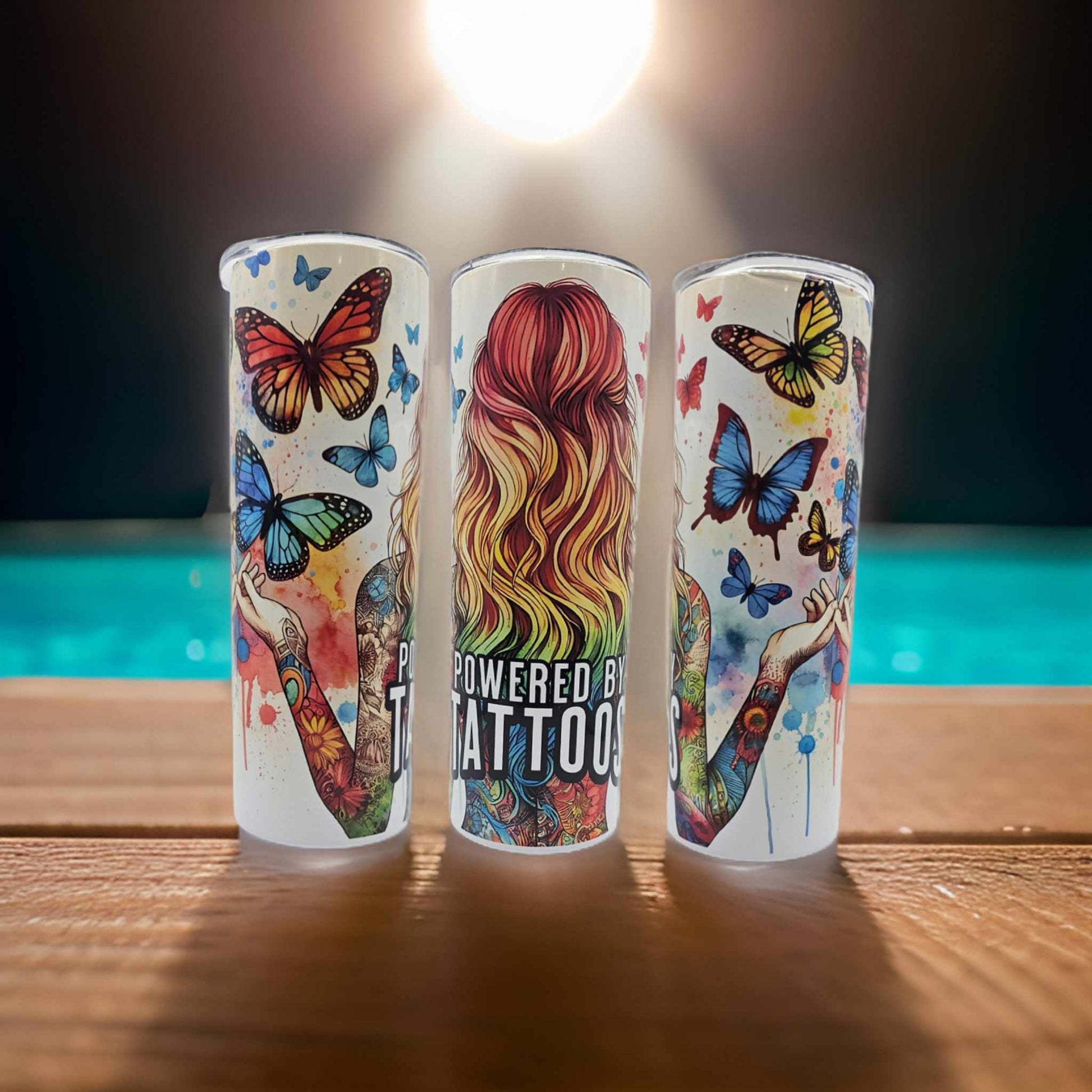 Double walled Insulated stainless steel Tumbler. Will keep drink cold for up to 12 hours and hot drinks hot for up to 6 Hours. They come with Clear Slide Lid, when not in use lid can be closed also comes with reusable Plastic straw. Comes with a Non-Stick bottom Our Tumblers can have a small white border on the bottom and some of our Tumblers can have a white border around the Top also depending on the Design