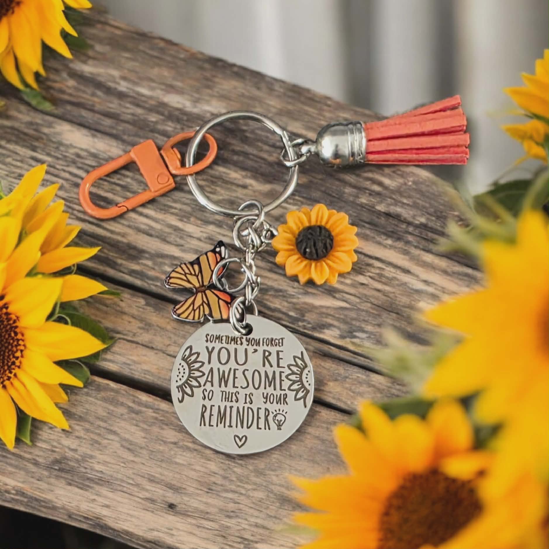 Beautiful Disk keychain that reads the quote "Sometimes you forget you're awesome so this is your reminder" with Sunflower and Butterfly charm. Disk measures at 3 cm. Comes on a Silver keychain, with a orange clasp attached to make it easy to attach to keys, purses, handbags. Also comes with a matching small tassel. Perfect gift for someone special you know loves Sunflowers, and needs that little reminder of how great they are sometimes.