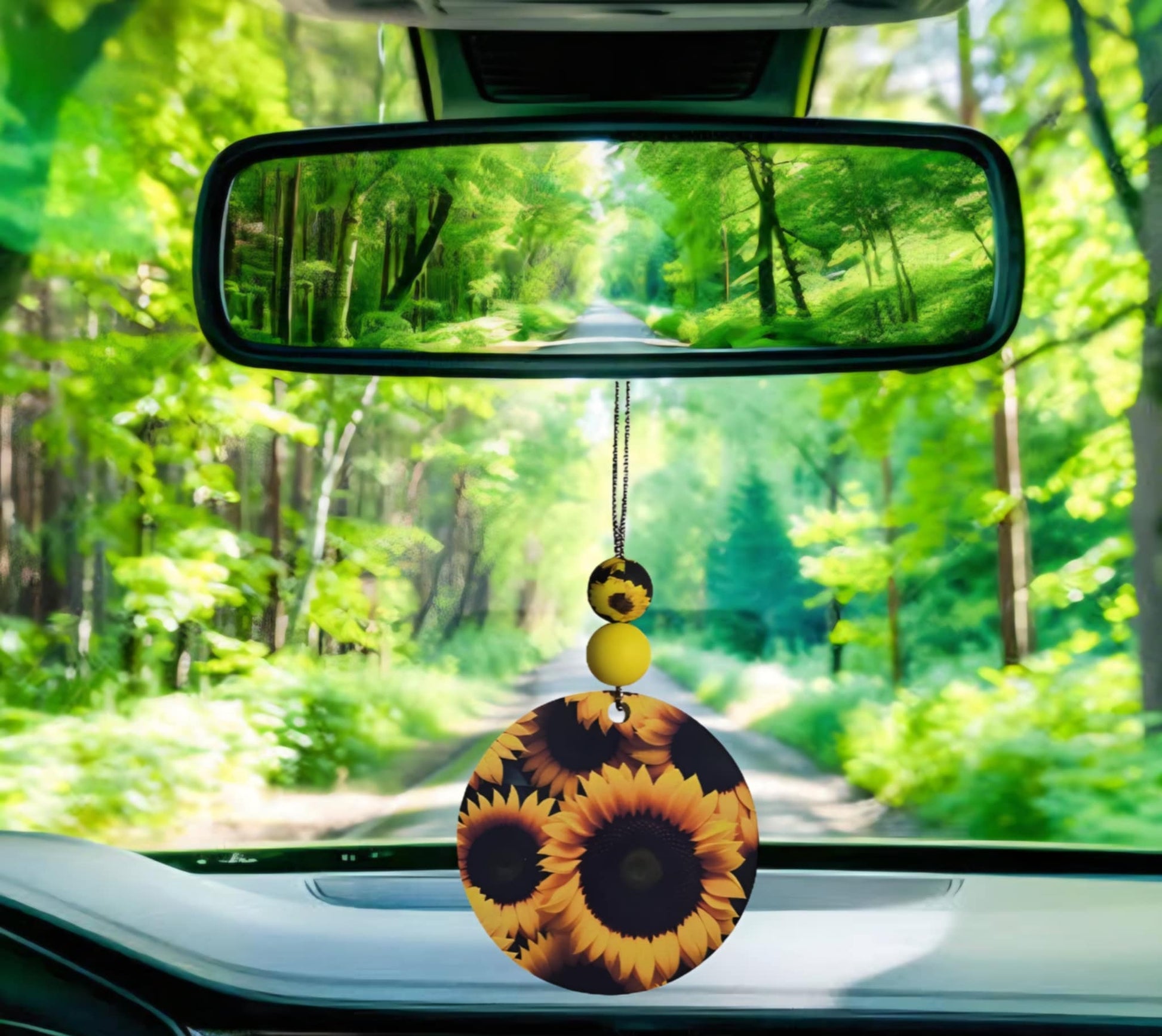 Disc is 7 cm Hanging length is 30 cm The disc is made out of MDF material, and the Chain is a Metal beaded chain, joined together by metal connectors. Add a touch of your style to your car with this gorgeous Car charm