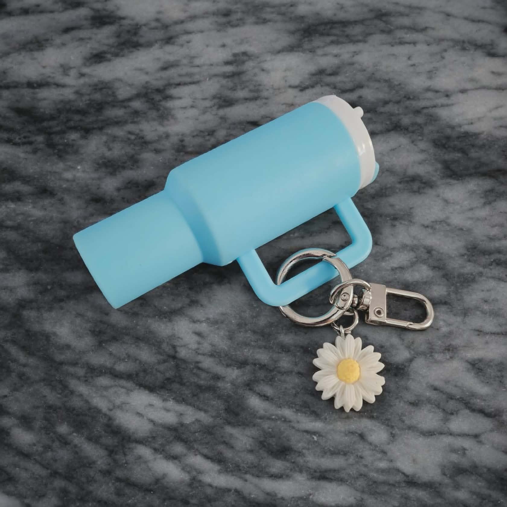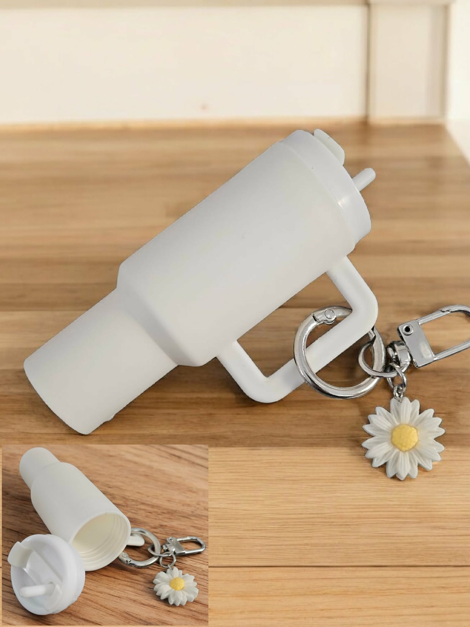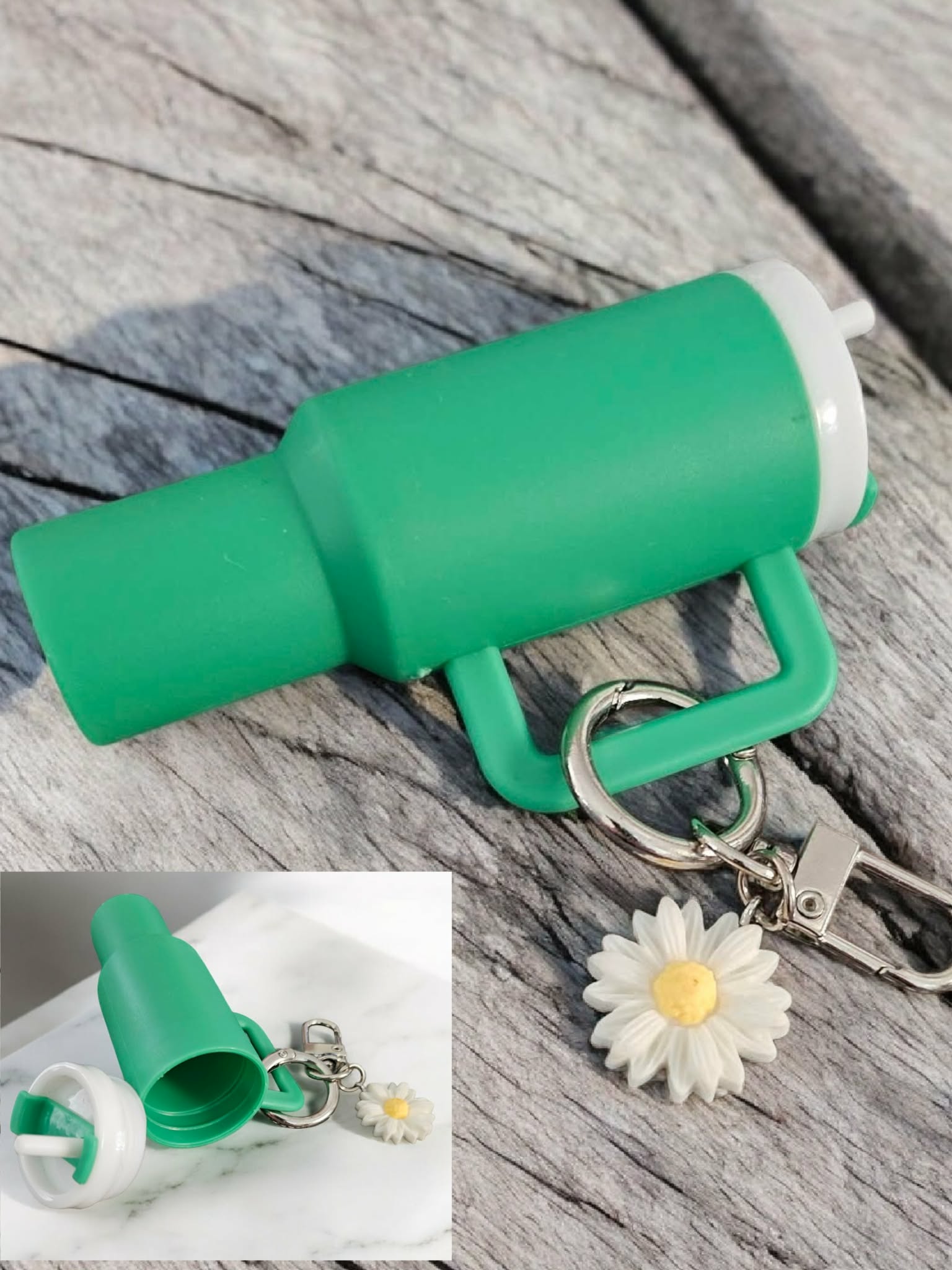 Tumbler keychain with white flower charm. Comes on a Silver keychain, with a Silver clasp attached to make it easy to attach to keys, purses, handbags. The lid on these beautiful keychains unscrews so that you are able to put your lip balm/ChapStick in there to keep it safe and always know where it is. Perfect gift for someone special.