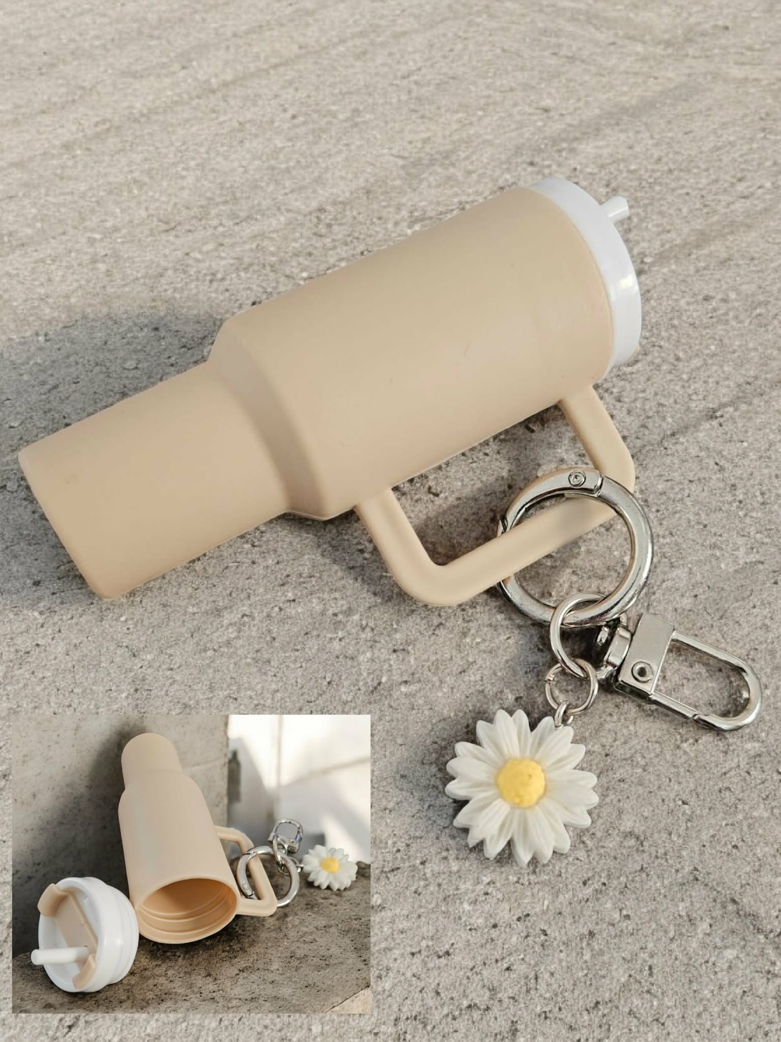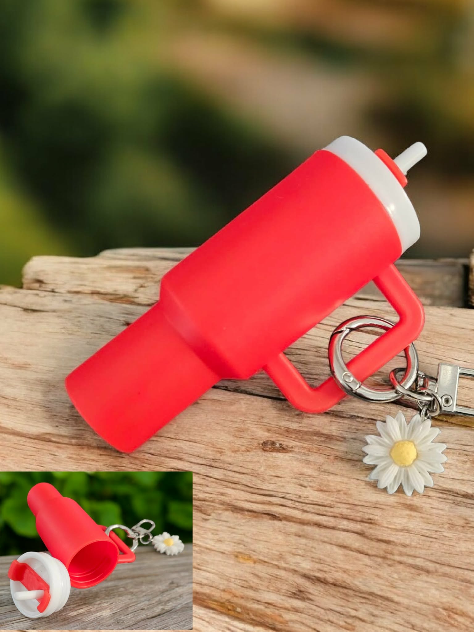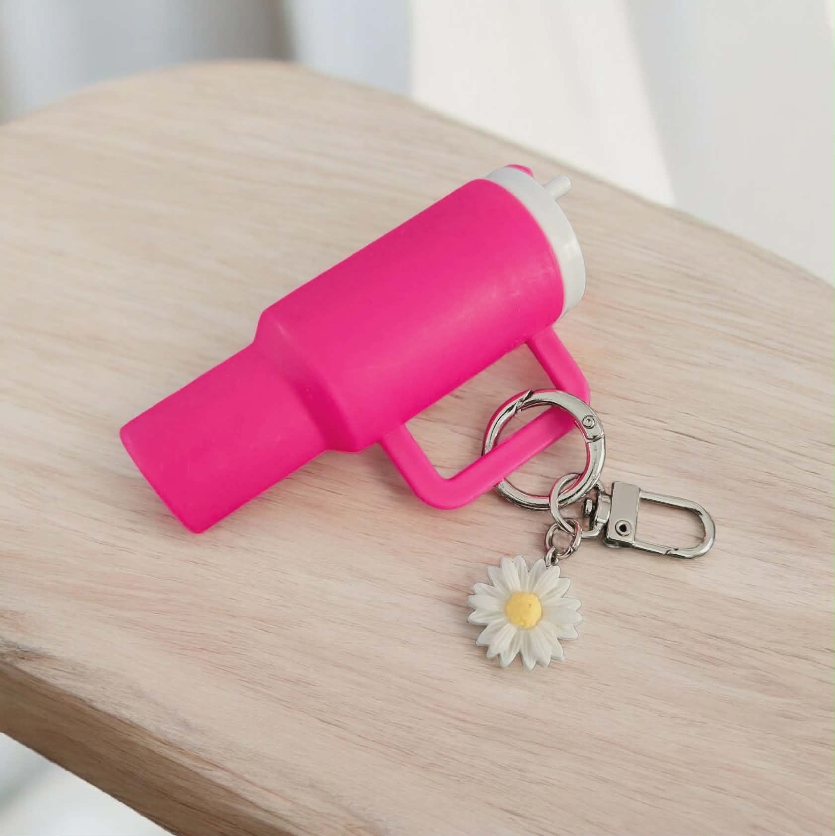 Tumbler keychain with white flower charm. Comes on a Silver keychain, with a Silver clasp attached to make it easy to attach to keys, purses, handbags. The lid on these beautiful keychains unscrews so that you are able to put your lip balm/ChapStick in there to keep it safe and always know where it is. Perfect gift for someone special.