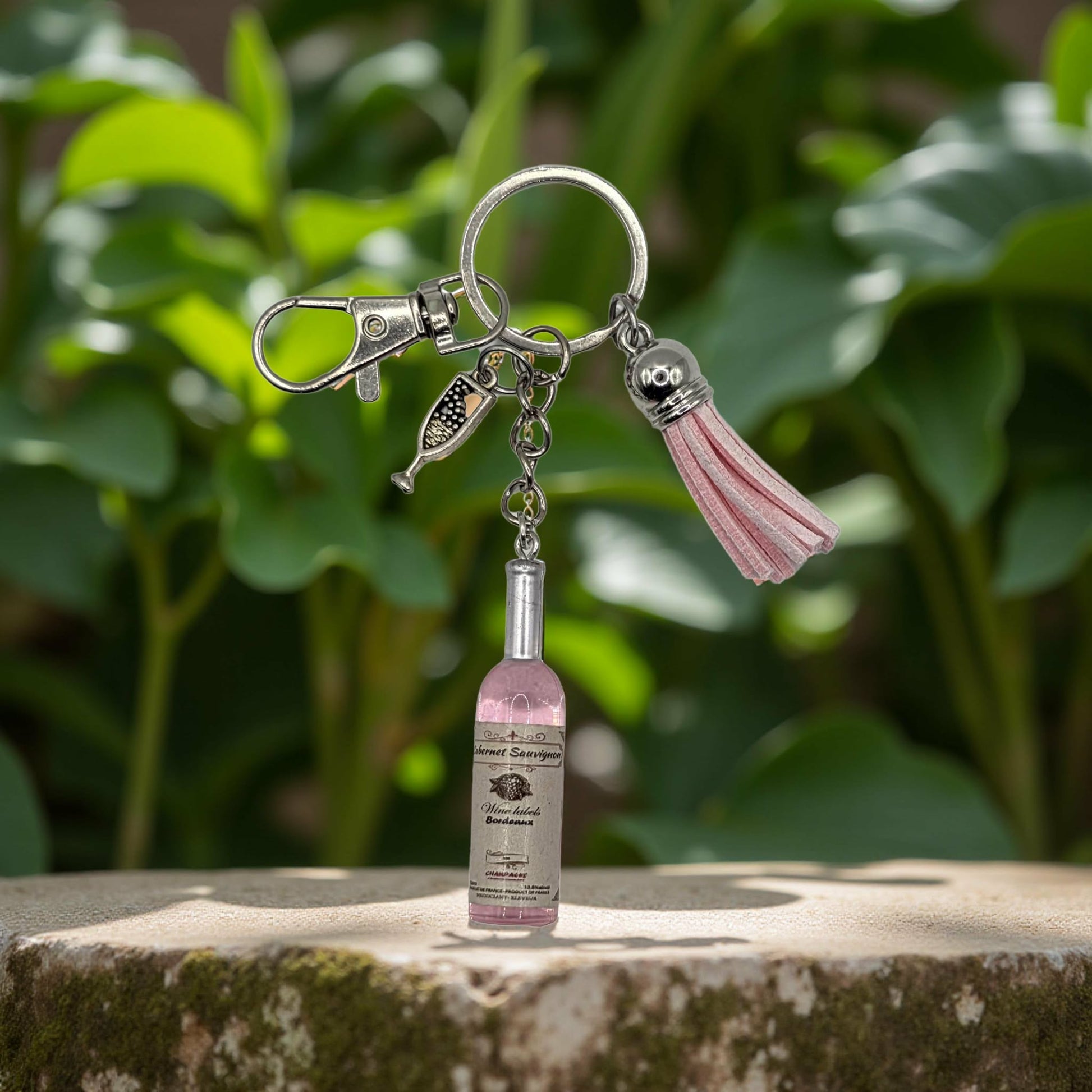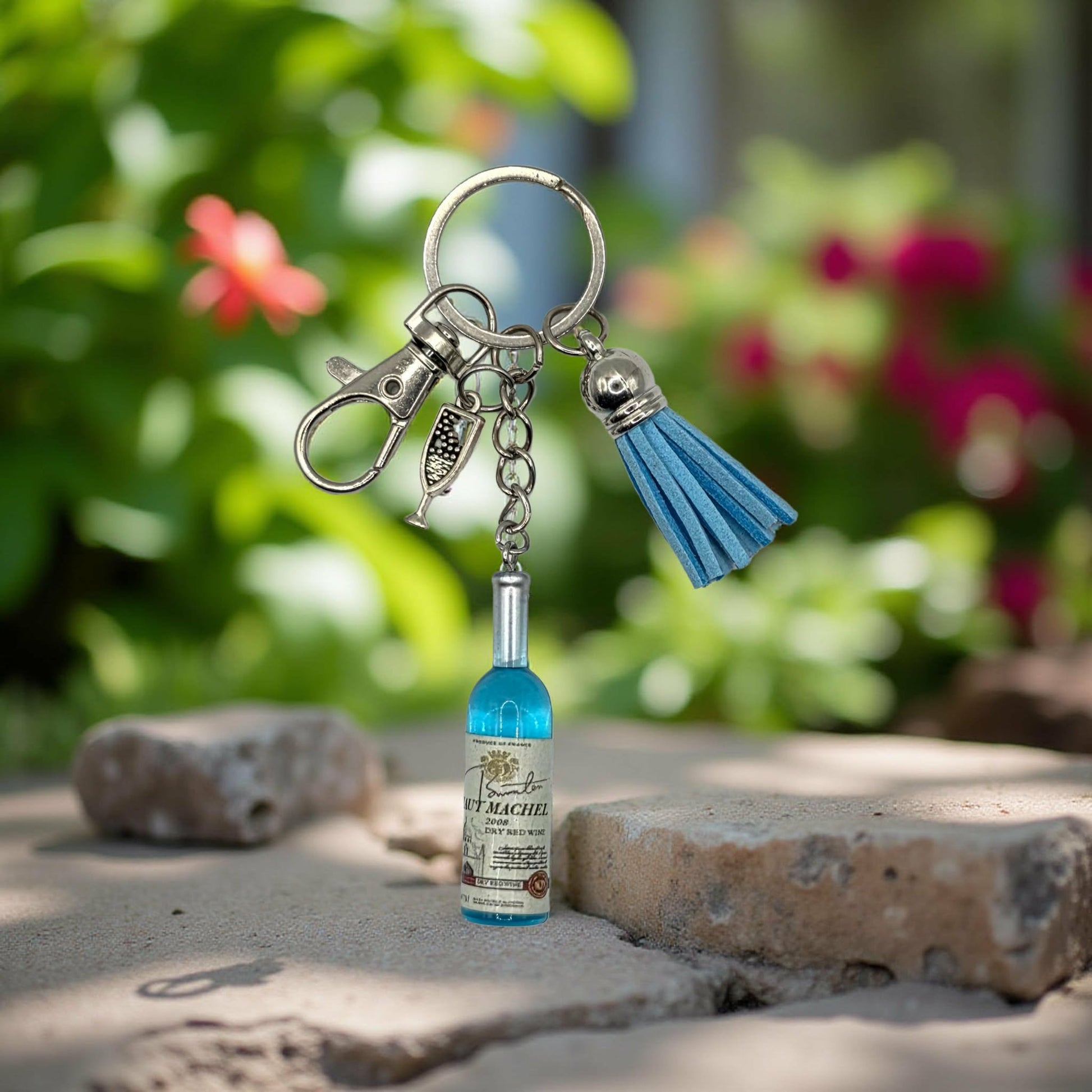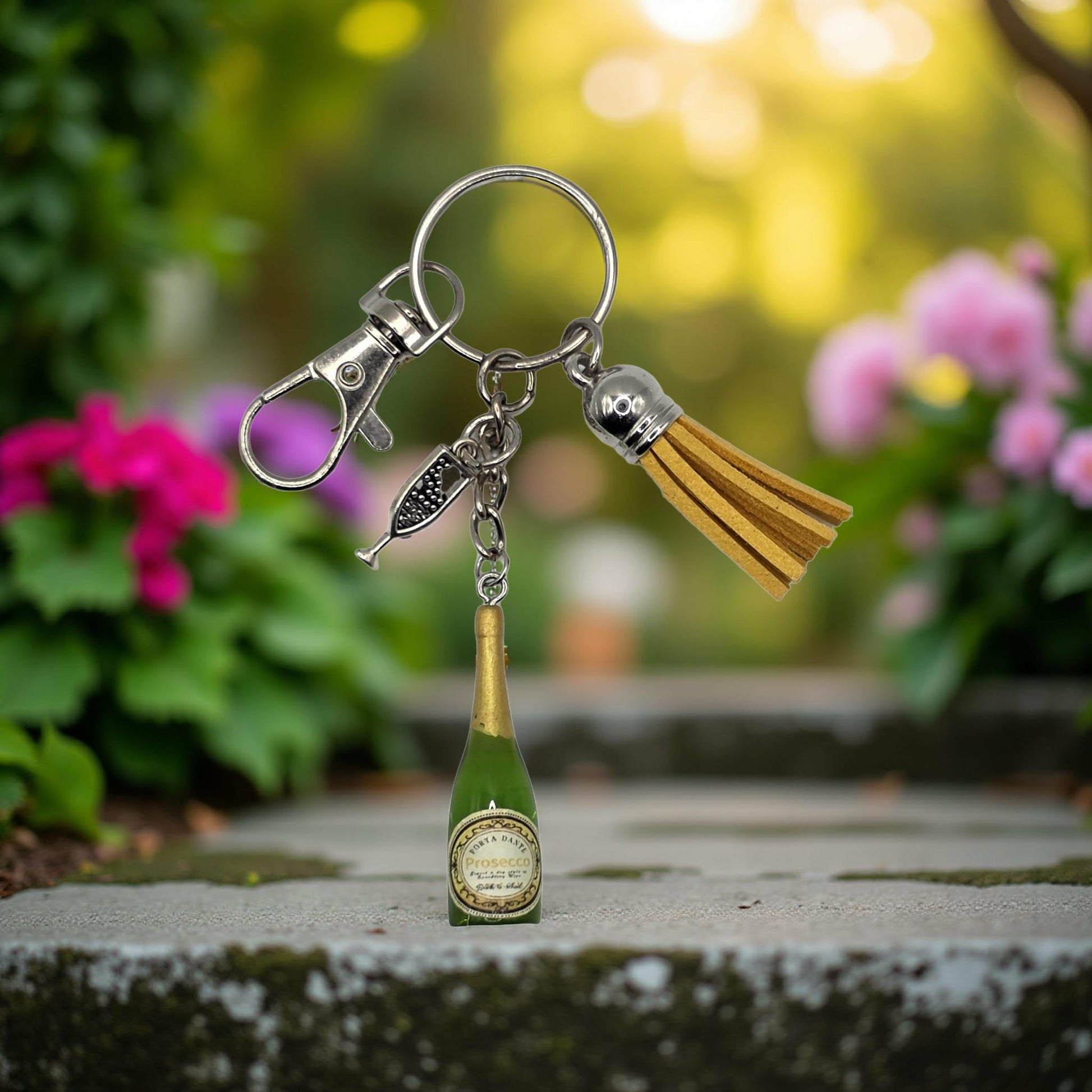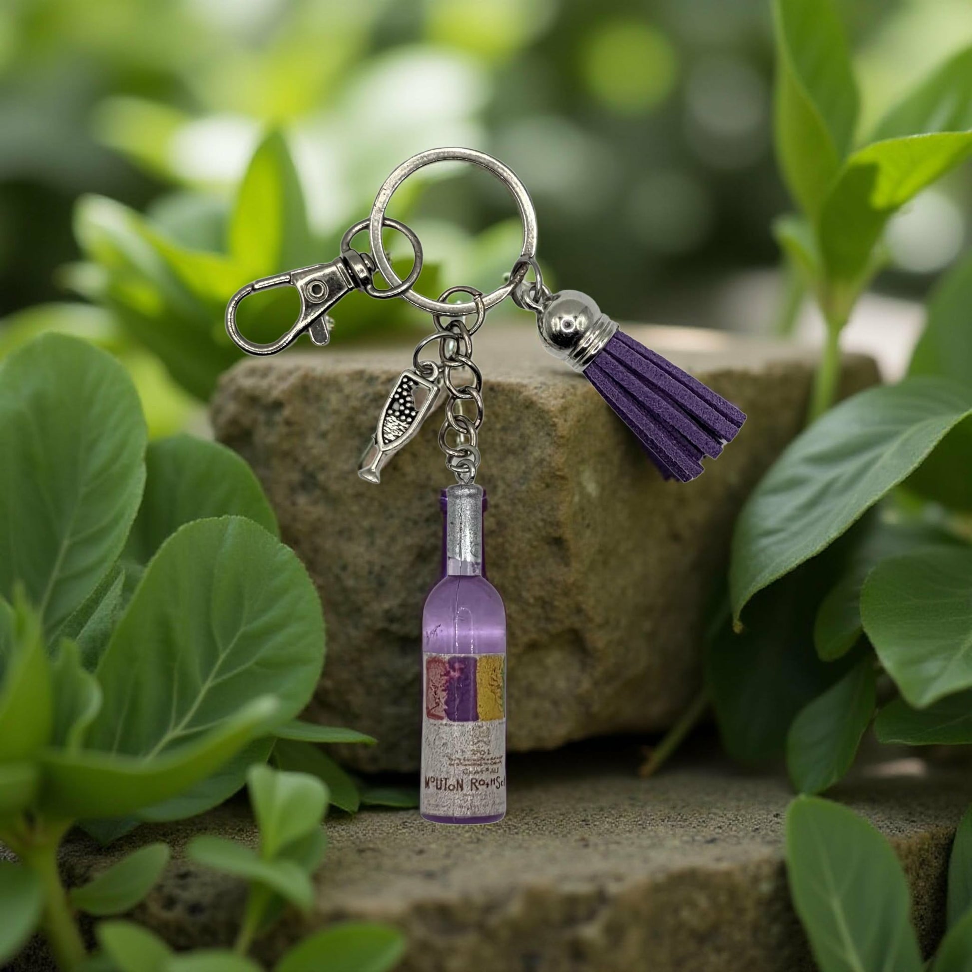 Wine bottle keychain. Comes with a champagne charm attached. Comes on a Silver keychain, with a silver clasp attached. Each keychain also comes with a matching coloured small tassel. Perfect gift for someone special you know is a wine lover.