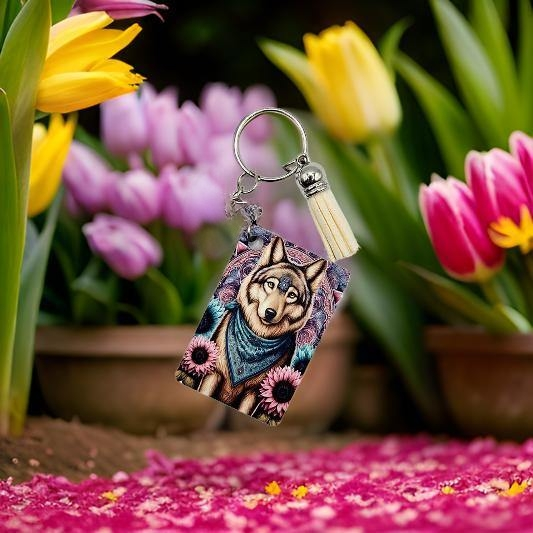 This rectangle keychain measures (L) 4 cm (H) 6 cm